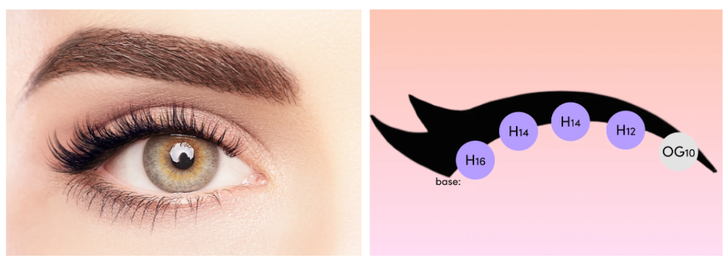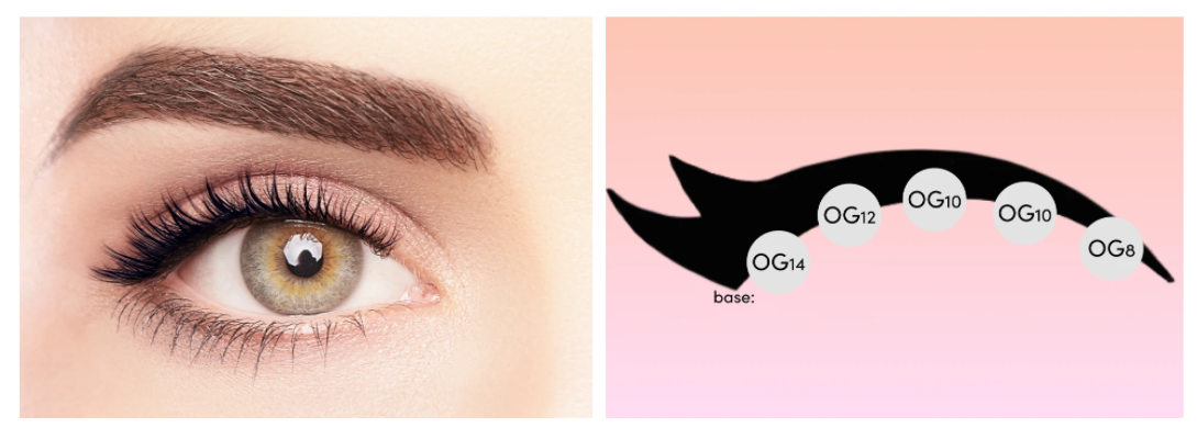 This lash map relies on an ultra-gradual flare, starting with 8 mm lashes in the inner corner and slowly increasing up to 14 mm on the outer corner. This design is ideal for balancing a downturned eye and making it seem more upturned.