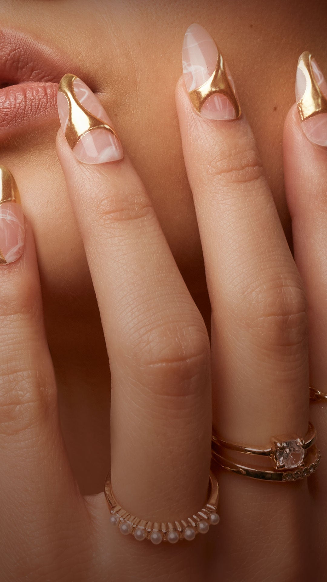 - Gold in My Veins - Designed in partnership with nail artist Tea L., Gold in My Veins is a true work of art. They feature a subtle marbled base for a pearlescent effect, with pulses of metallic gold flowing organically across the surface. These press-ons are long, almond-shaped, glossy, and guaranteed to draw attention.