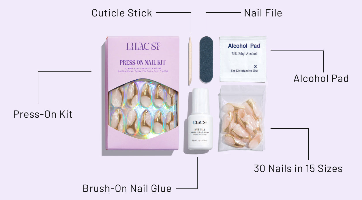 - Fit - Finding the right fit is incredibly important for the longevity of your manicure and your comfort. The best way to ensure your press-on nails fit is to purchase from brands that offer multiple size options in one kit. The Lilac St. Press-On Nail sets come with 30 nails of various sizes, so you can always find a match.